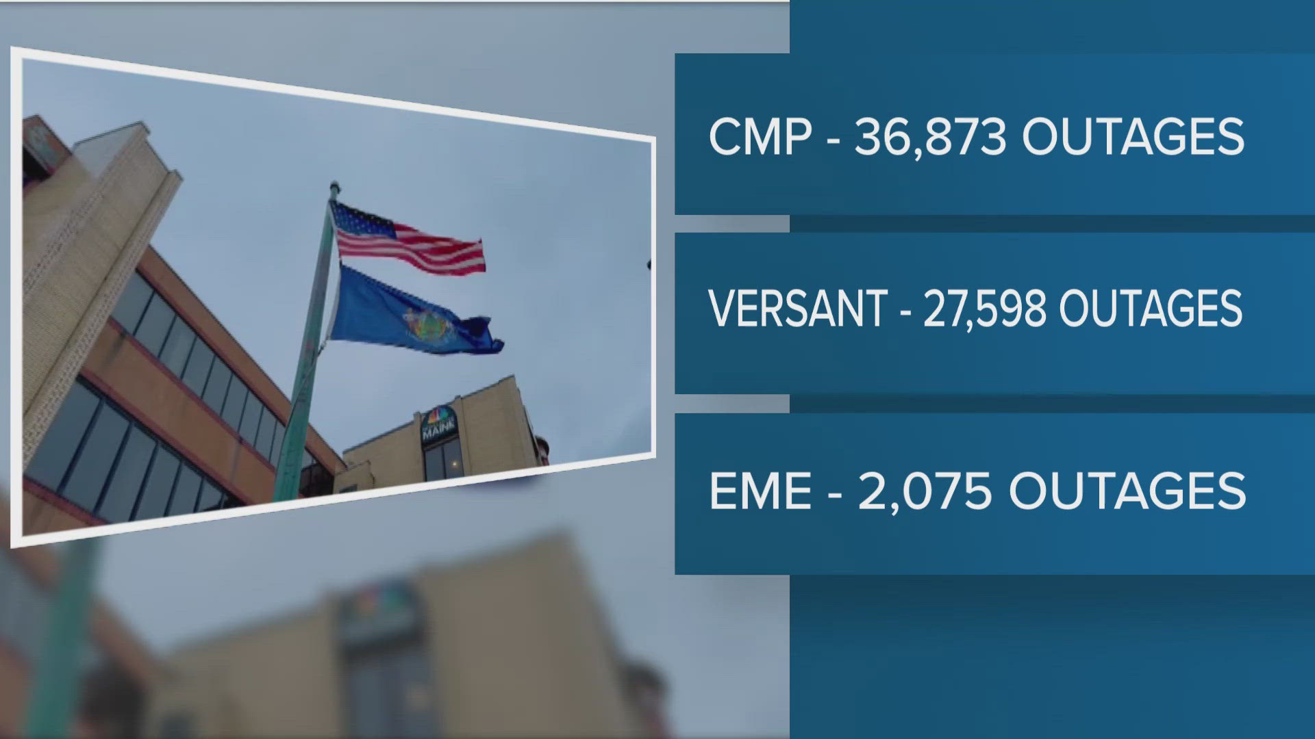 As of 12:45 p.m., Central Maine Power reported 20,917 customers without power, Versant Power reported 21,805 without power, and Eastern Maine Electric Cooperative reported 2,165 without power.