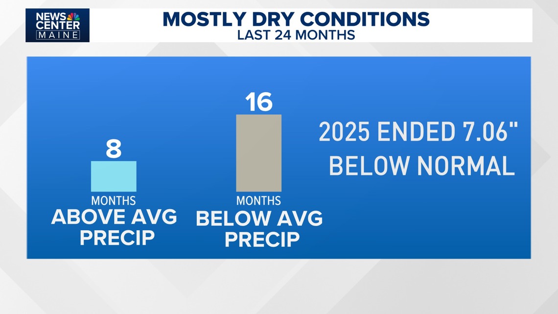 Below-normal snowfall also continues a broader dry trend across Maine. Over the past 24 months, only eight have seen normal or above-normal precipitation, helping drought conditions persist statewide.