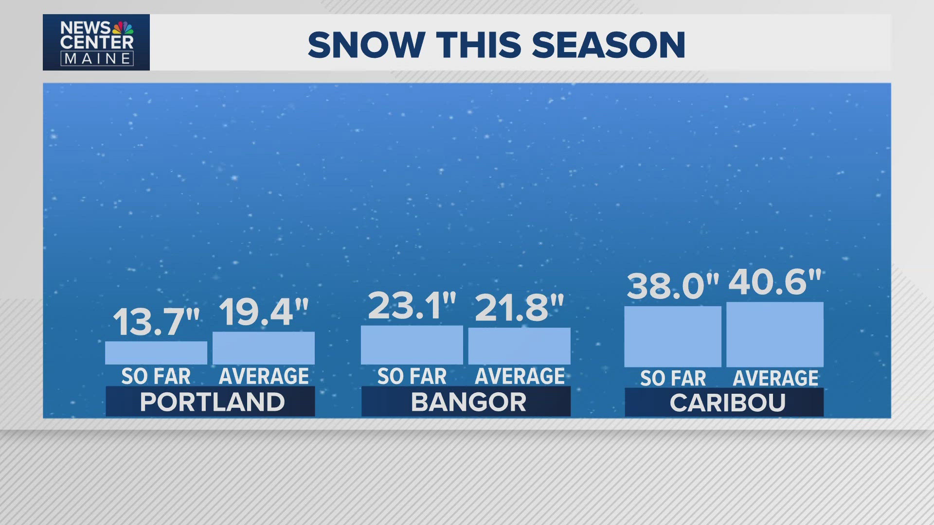 Portland has recorded just under 14 inches of snow this season, several inches below the typical 19 inches by this point. Snowfall has been closer to average in Bangor and Caribou, though Caribou is also a couple inches below normal.