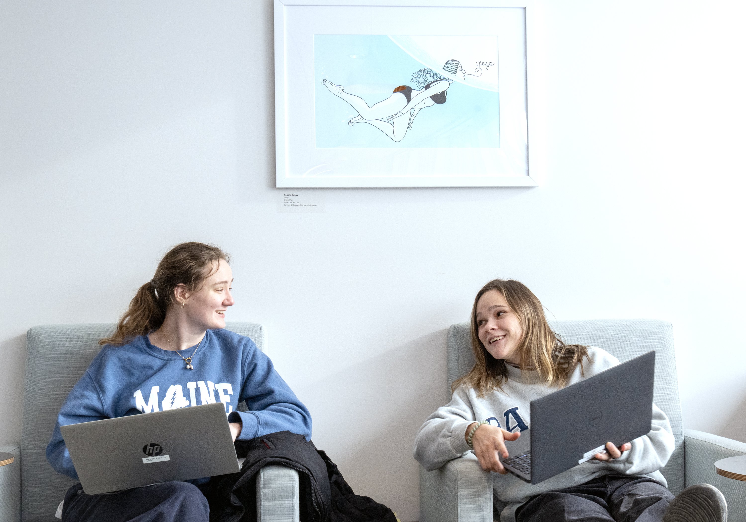 Kelly Shinnick, left, and Darcy Cochroan, both of Portland, work together under an illustration by Isabella Rotman at the Falmouth Memorial Library. (Daryn Slover/Staff Photographer)
