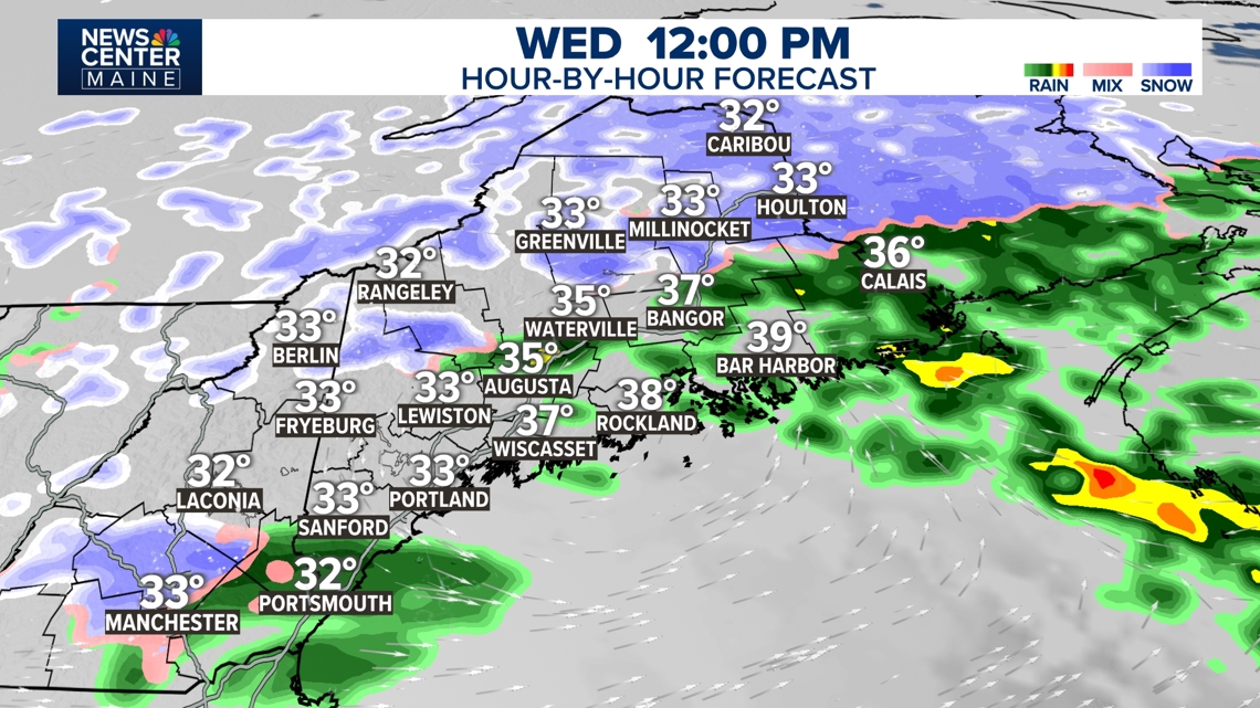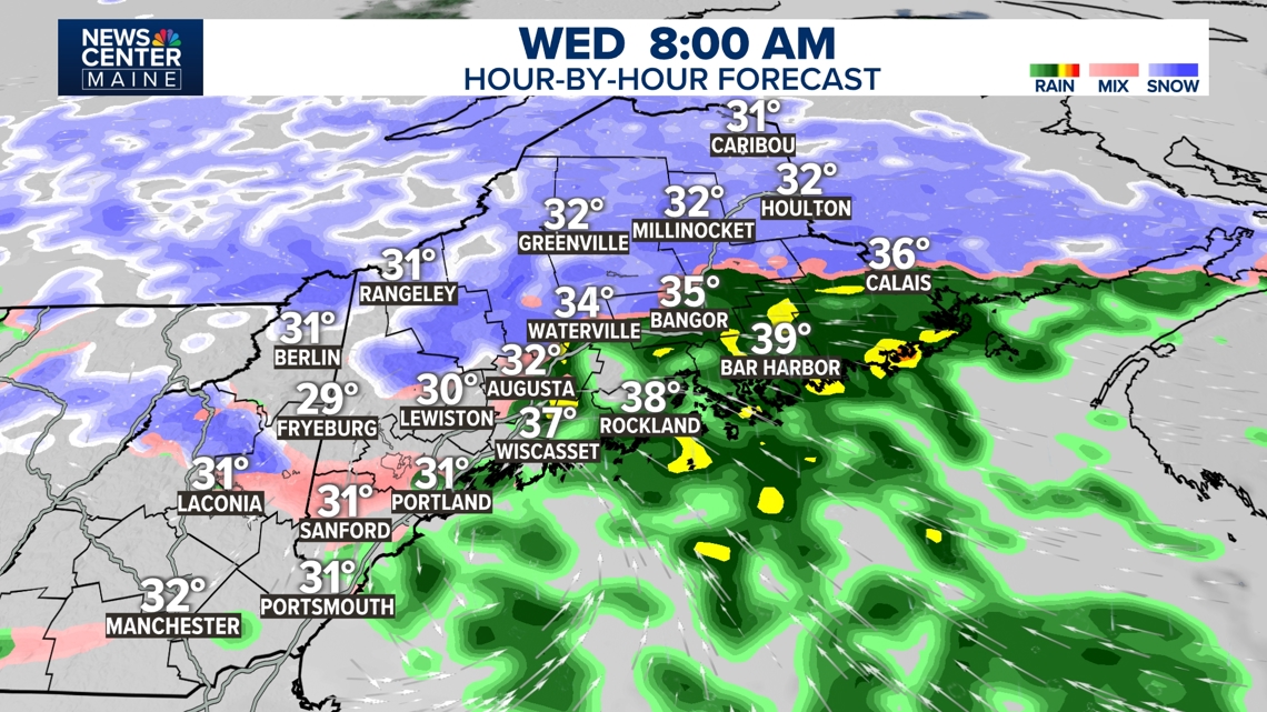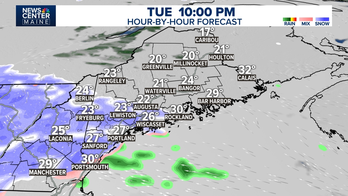 PORTLAND, Maine — TUESDAY NIGHT: Another storm system moved in from the west. Precip began as snow in western and southern Maine, moving in after midnight. Overnight lows in the mid to lower 20s and teens. Northeast breeze at 5-10 mph.
