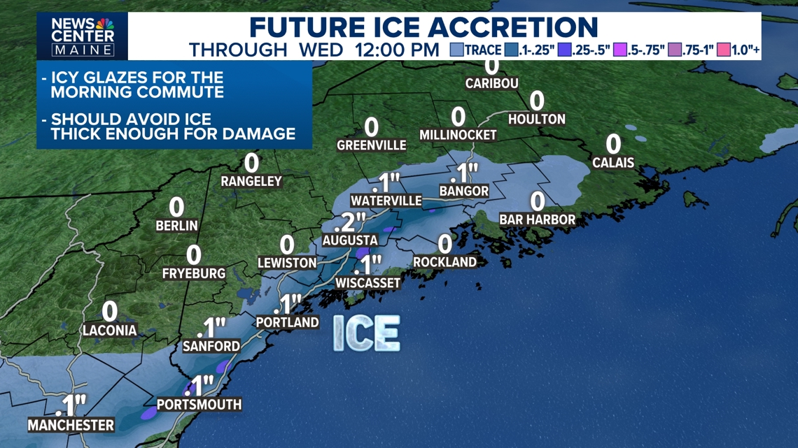 WEDNESDAY: A transition to freezing rain began near the coast on Wednesday morning. The stripe of light freezing rain was not large in area; instead, it was a narrow band near the Maine Turnpike. The Maine Turnpike saw several crashes Wednesday morning.