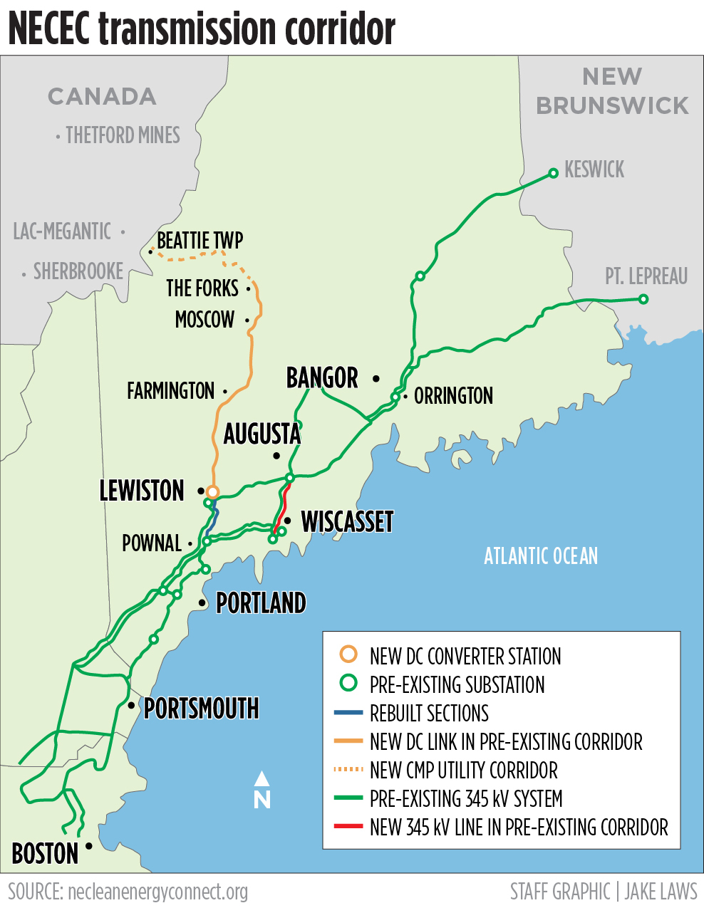 The 145-mile line connects a hydropower generation facility in Quebec, Canada, to a converter station in Lewiston, cutting through Franklin and Somerset counties to inject 1,200 megawatts of renewable electricity into the New England grid. It includes a 53-mile segment that required trees to be cleared northwest of Caratunk; the rest runs along an already-existing corridor.