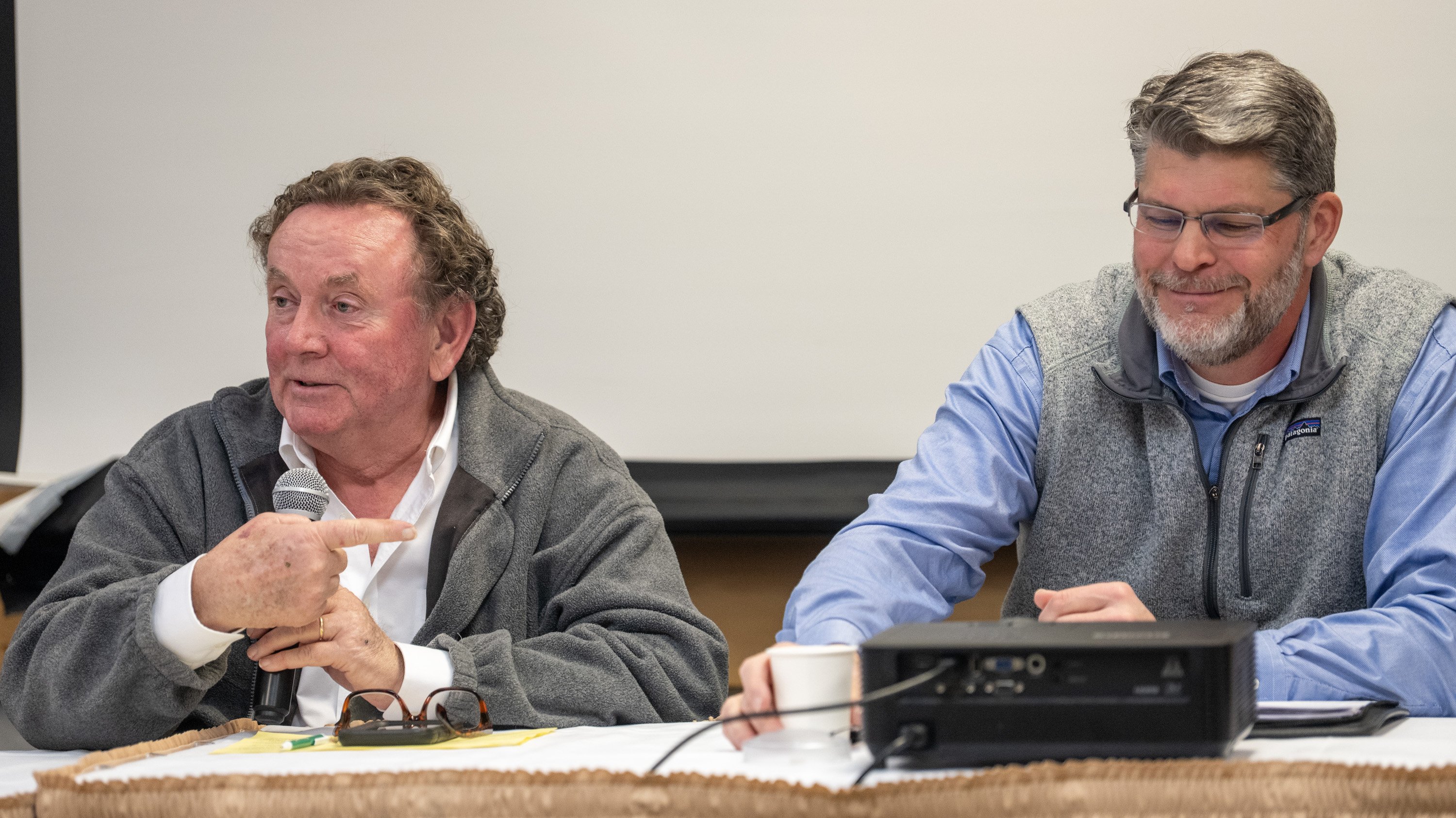 Bill Randall, a representative from dairy industry, left, and Dana Doran, executive director of Professional Logging Contractors of the Northeast, listen Tuesday as part of the Health & Wellness in Agriculture and Forestry panel discussion at the 85th annual Maine Agricultural Trades Show in the Augusta Civic Center in Augusta. (Joe Phelan/Staff Photographer)
