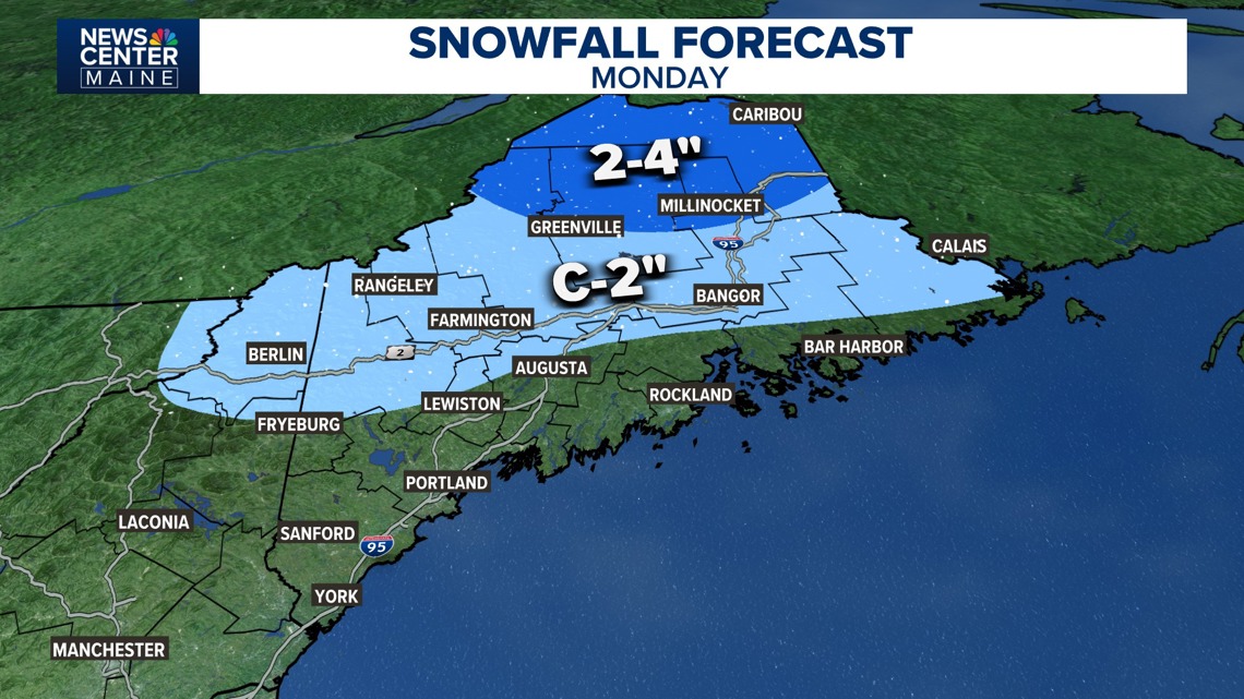 2-4" of snow and sleet is expected on Monday in northern Maine, to the south expect much lighter amounts.
