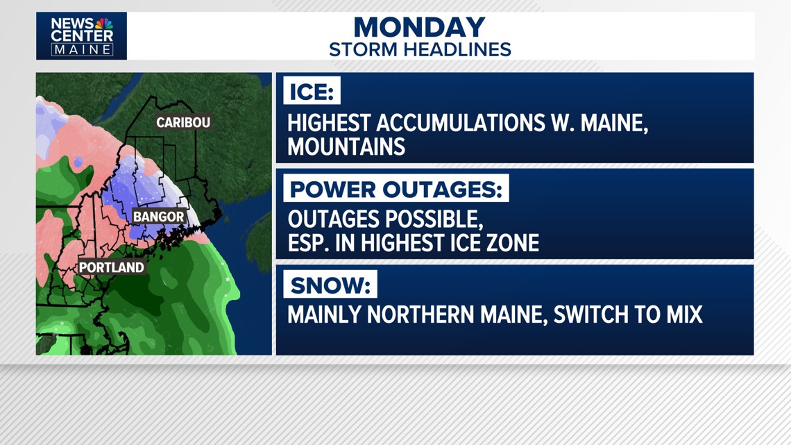 MAINE, USA — A winter storm will continue to impact Maine the entire day Monday. This storm will have a messy, icy mix of snow, sleet, and freezing rain across the state, with big impacts to travel expected.