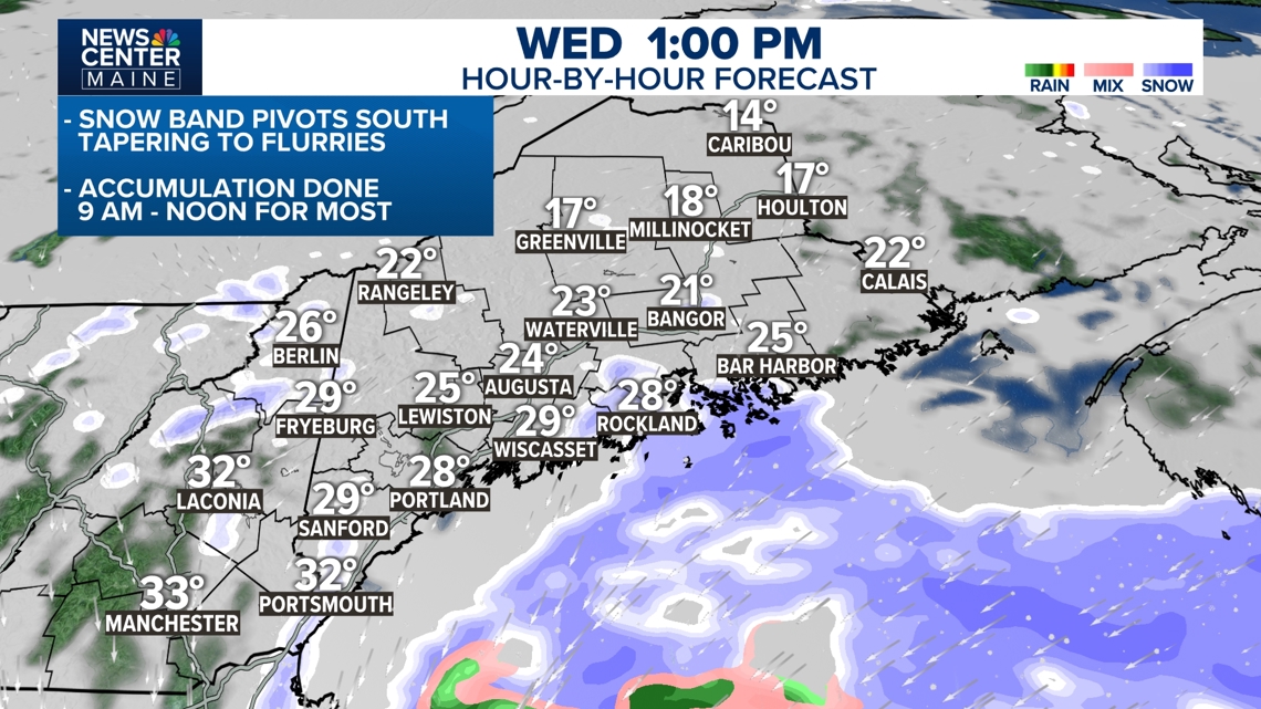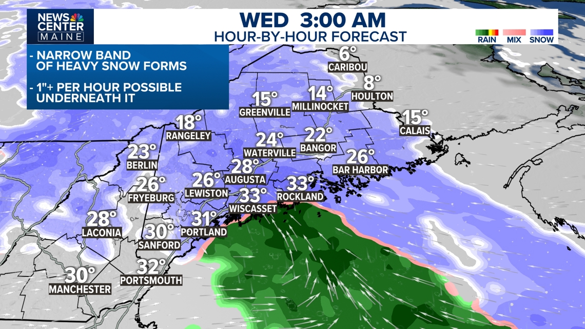 Less snow is expected from Sanford south including coastal York County, 2" to 5", and on the other side of this banding, including Bangor and Bar Harbor.